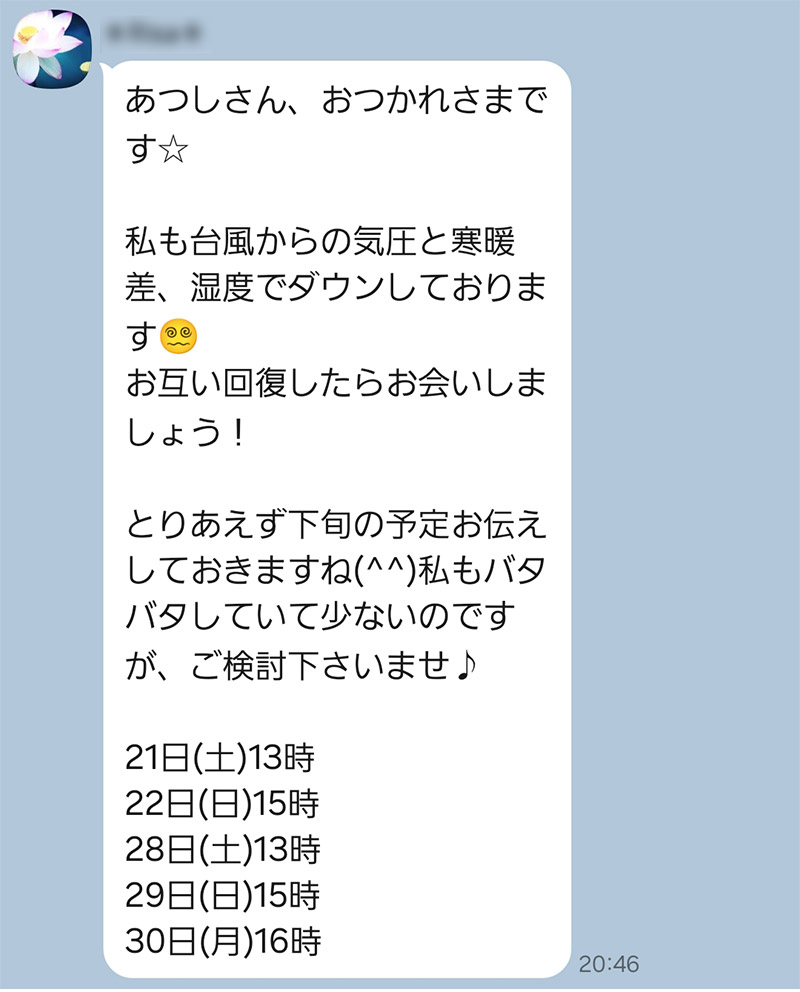 定期的にSMプレイをしている人なのですが、こんな感じで日程候補を連絡頂いて、タイミングが合えば会うというケースが多いです。